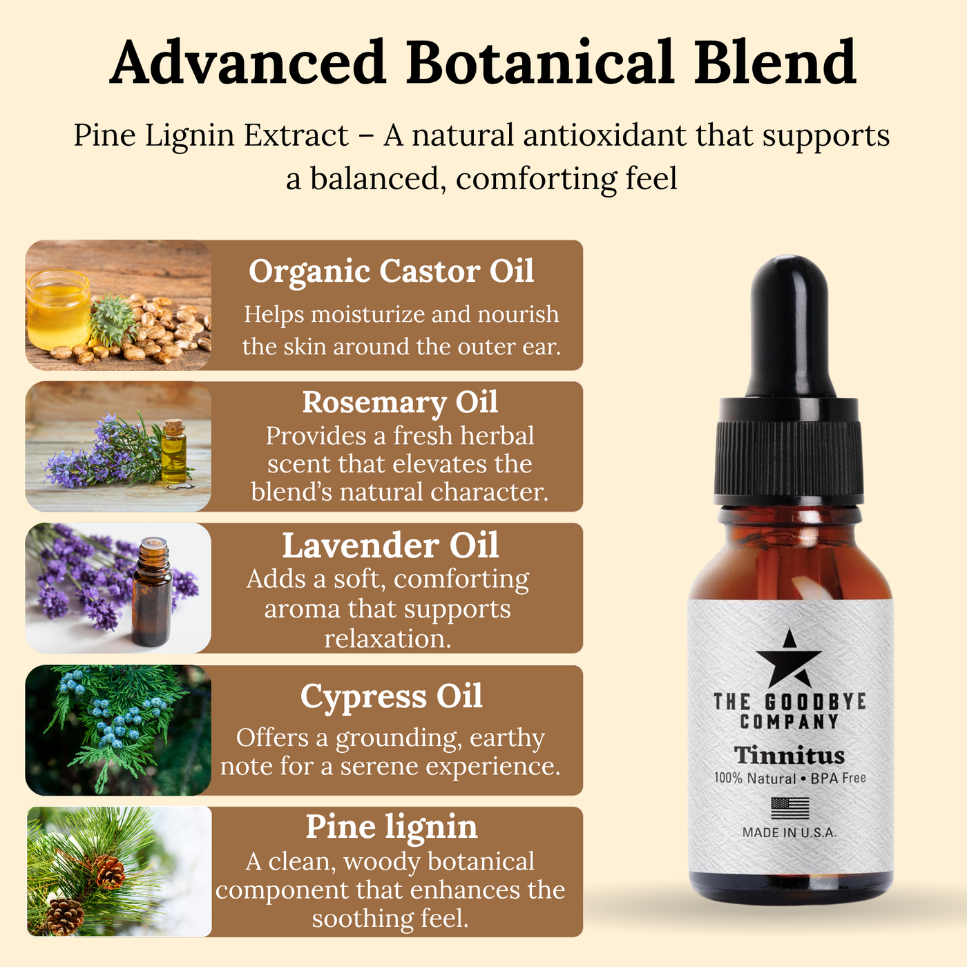 - EAR RINGING RELIEF: Reduce the irritating ear noise symptoms with The Goodbye Company Ear Ringing! Made with all natural ingredients, this superior quality blend of essential oils will alleviate the discomfort from the ringing, buzzing and hissing sounds within your ears.