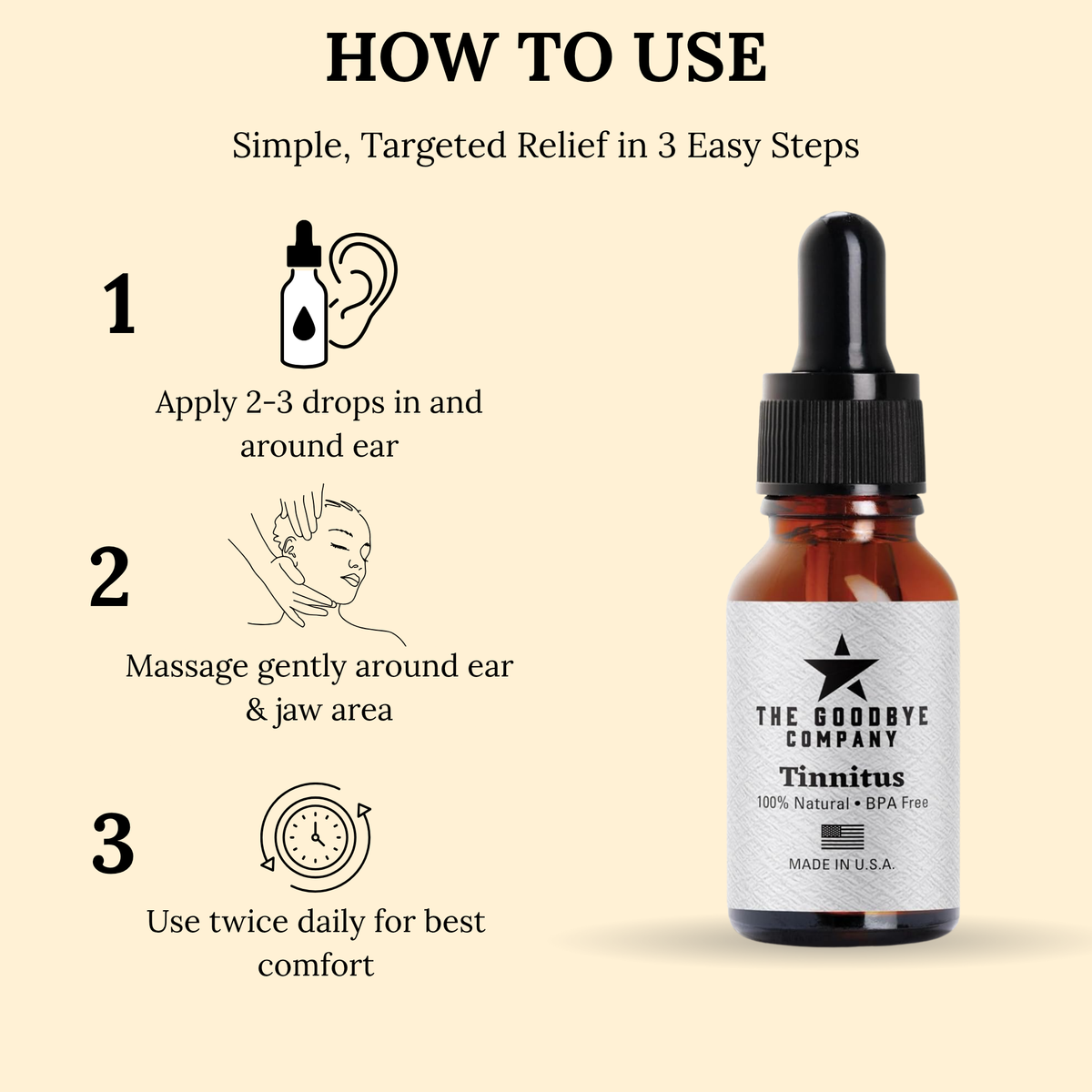 For soothing relief of tinnitus, apply two drops directly into the ear and massage one drop into the soft part of the jawline behind the ear. The Goodbye Company Ear Ringing penetrates the ear to clear the symptoms of chronic and debilitating ear ringing - relieve your discomfort and frustration from this condition.