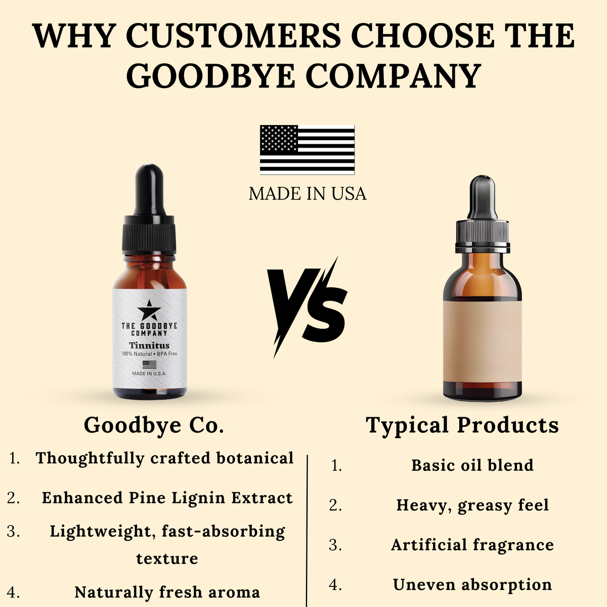 The Goodbye Company Ear Ringing is made with a blend of quality ingredients and offers superior relief from the harsh and irritating symptoms of tinnitus or ear ringing. While results may vary, the GoodBye Companys many customers have welcomed the relief from this miserable condition made possible by The Goodbye Company Ear Ringing.